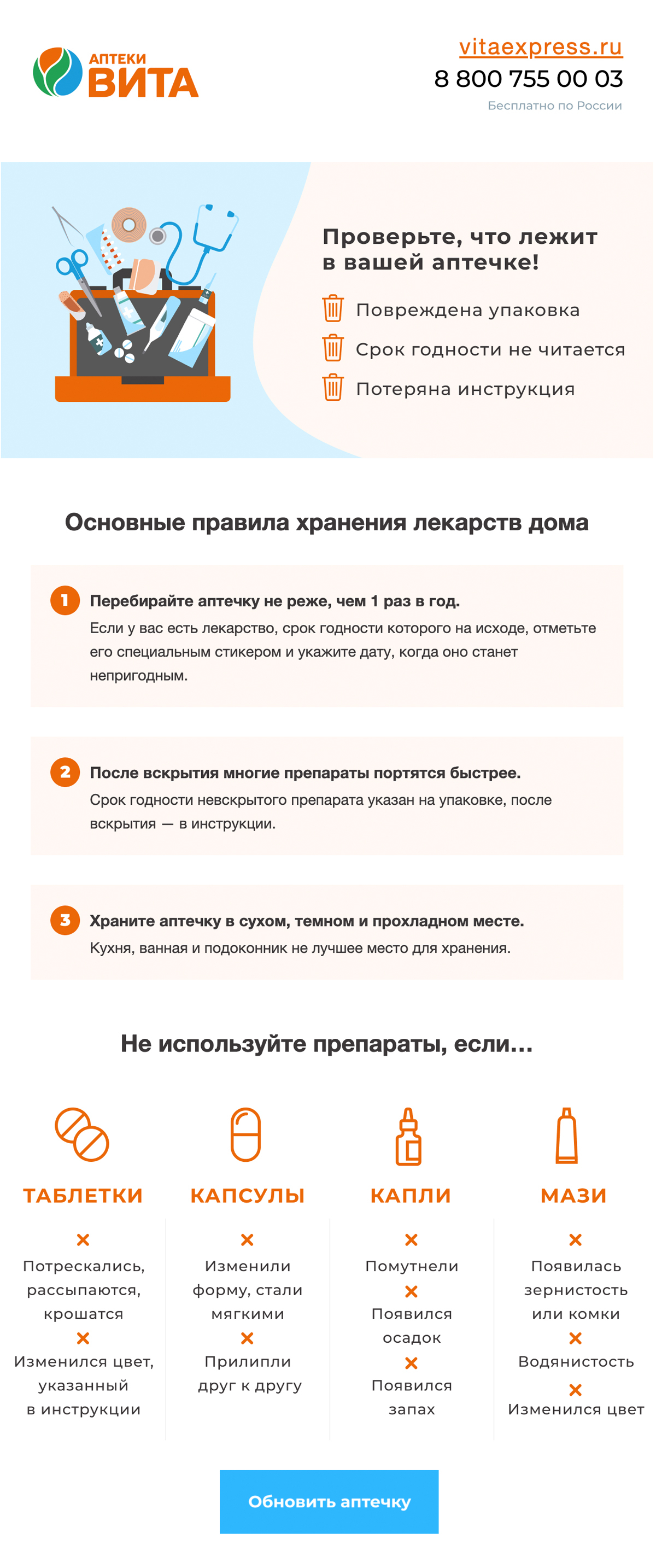 Письмо так и просится в закладки. Полезный чек-лист, к которому стоит периодически возвращаться — сразу возникает желание навести порядок в аптечке.
