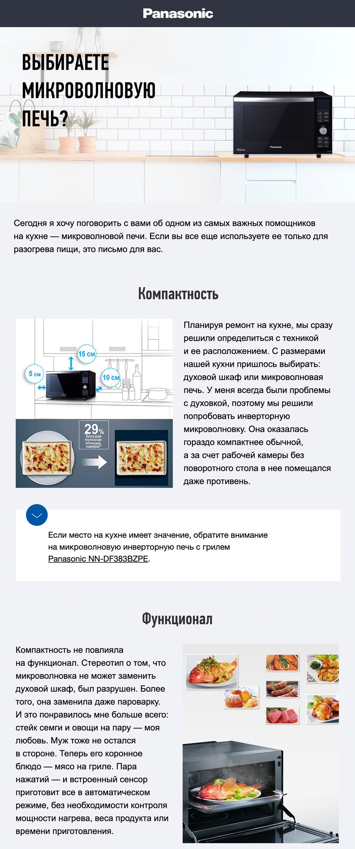 Интересная подача в режиме сторителлинга заставляет читателя прислушаться к советам по выбору товаров.
