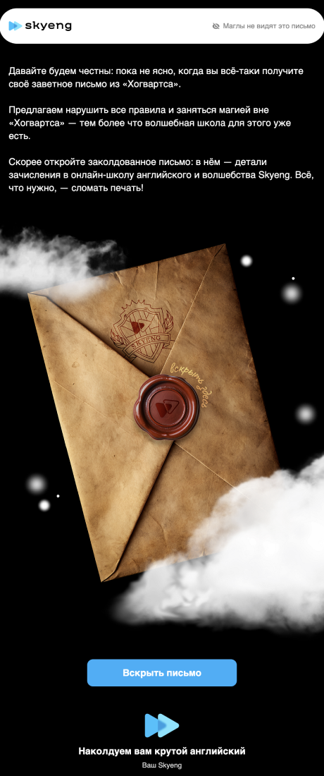 Классное письмо с геймификацией, почти что AMP, но нет!) Предлагают открыть письмо из Хогвартса и пересылают на лендинг с этой игрой. Под печатью промокод на скидку в школу волшебства и английского языка.