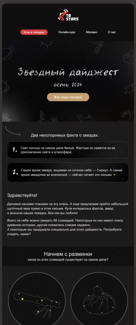 Креативный звездный дайджест астрономических мероприятий сделан с помощью AMP. По ходу письма можно поиграть в угадайку и предположить, какие созвездия необычных форм существуют на самом деле.