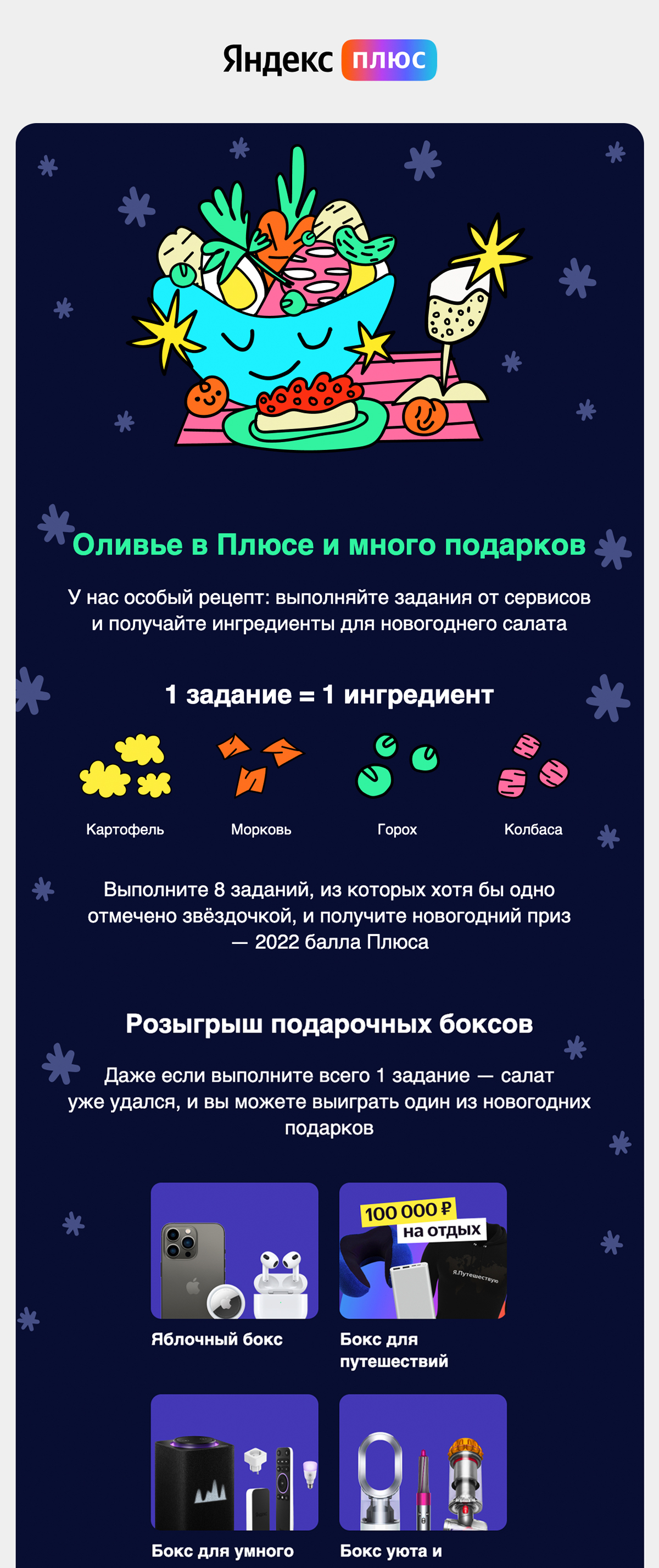 Приятный дизайн и отличная задумка для анонсирования новогодней акции: особый рецепт салата Оливье. Выполненное задание — новый ингредиент. Побуждает к участию.