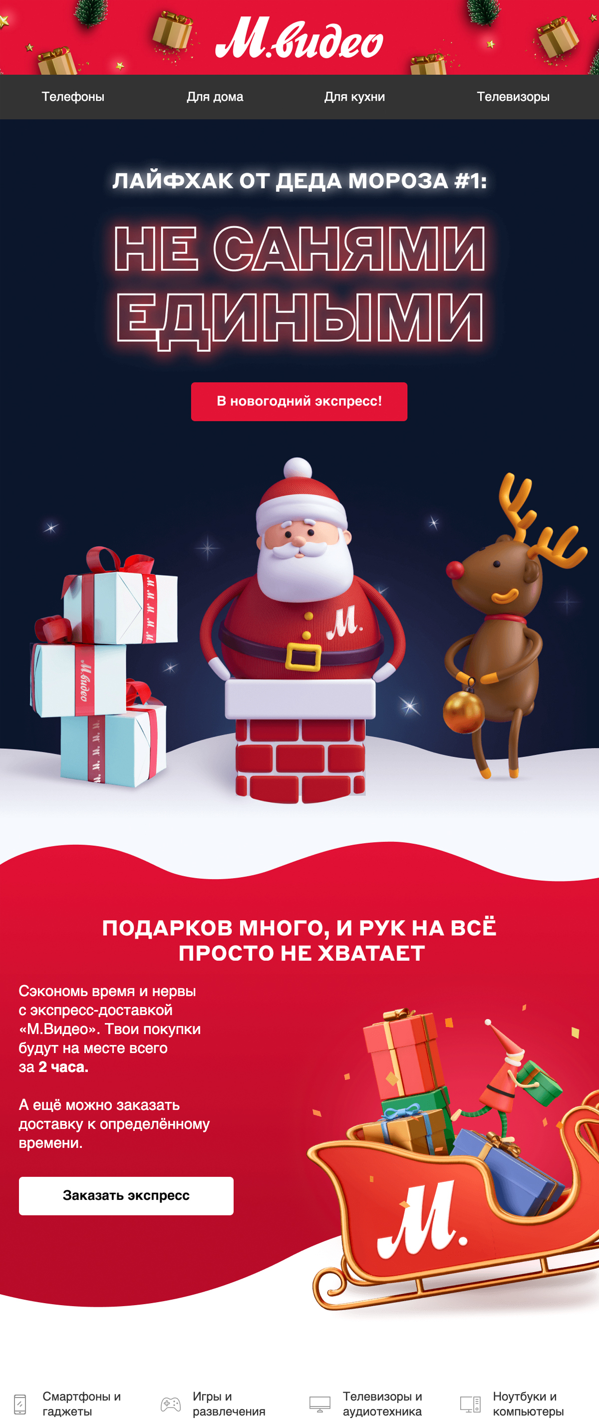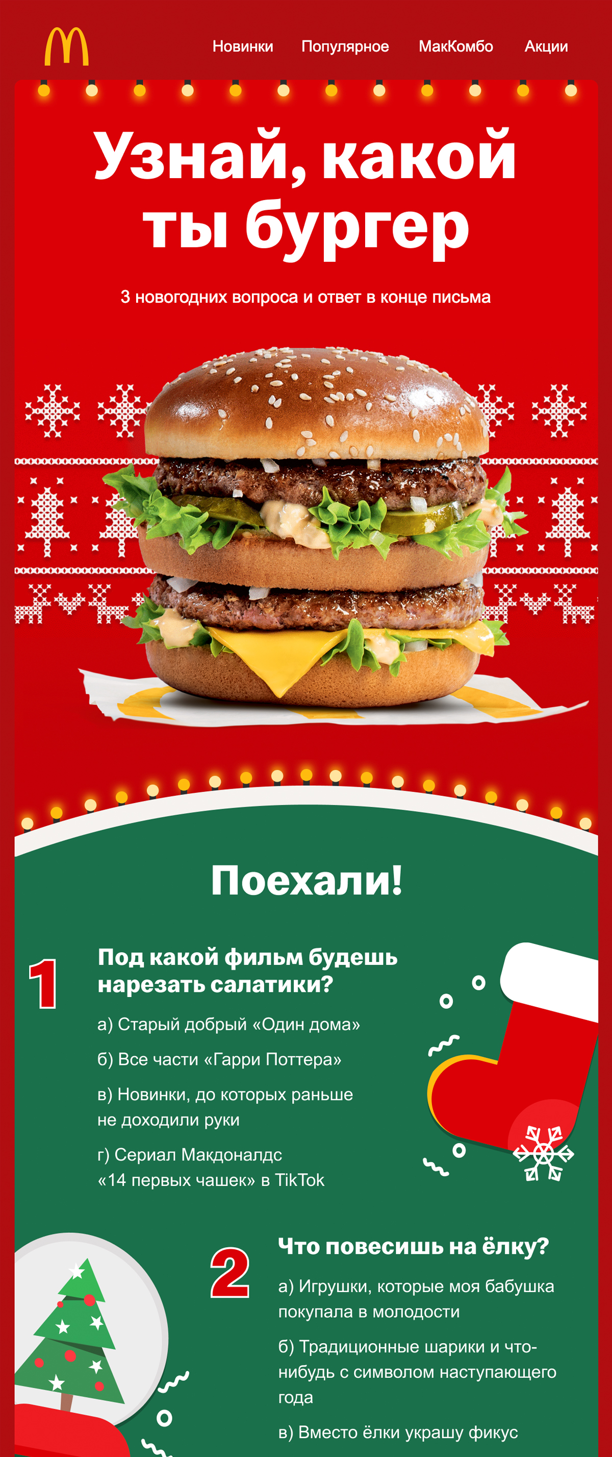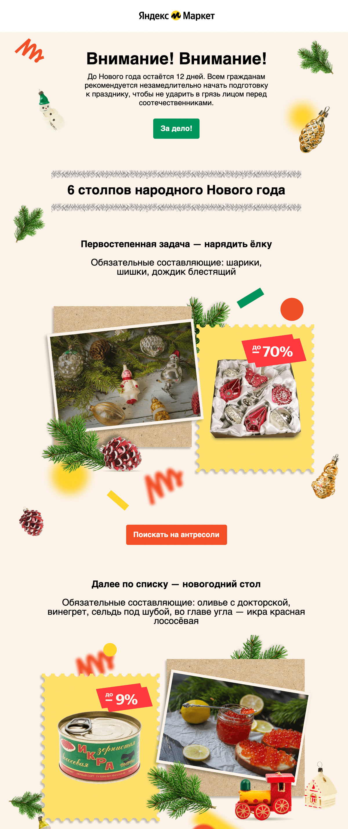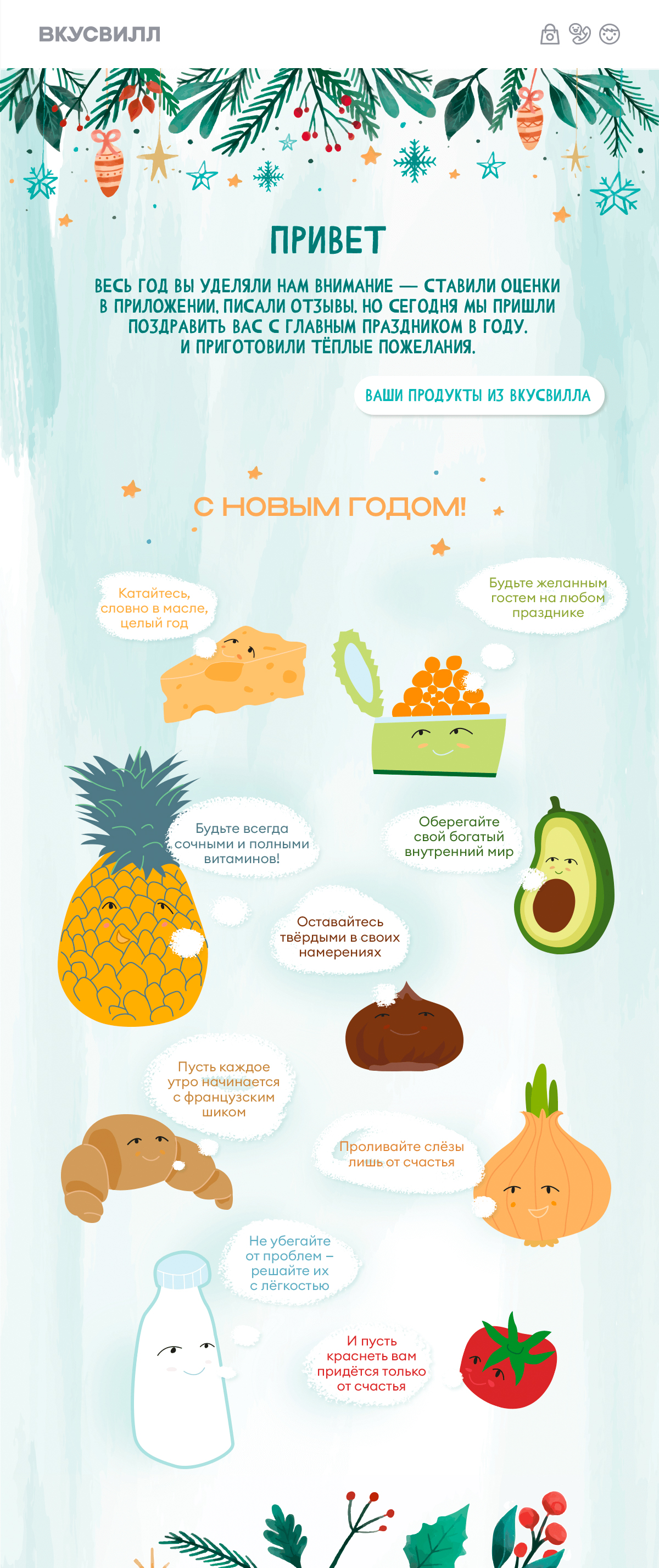 Задумка и дизайн на высоте. А что вы хотели, когда продукты поздравляют с Новым годом?) Не хватило лишь кнопки для заказа.
