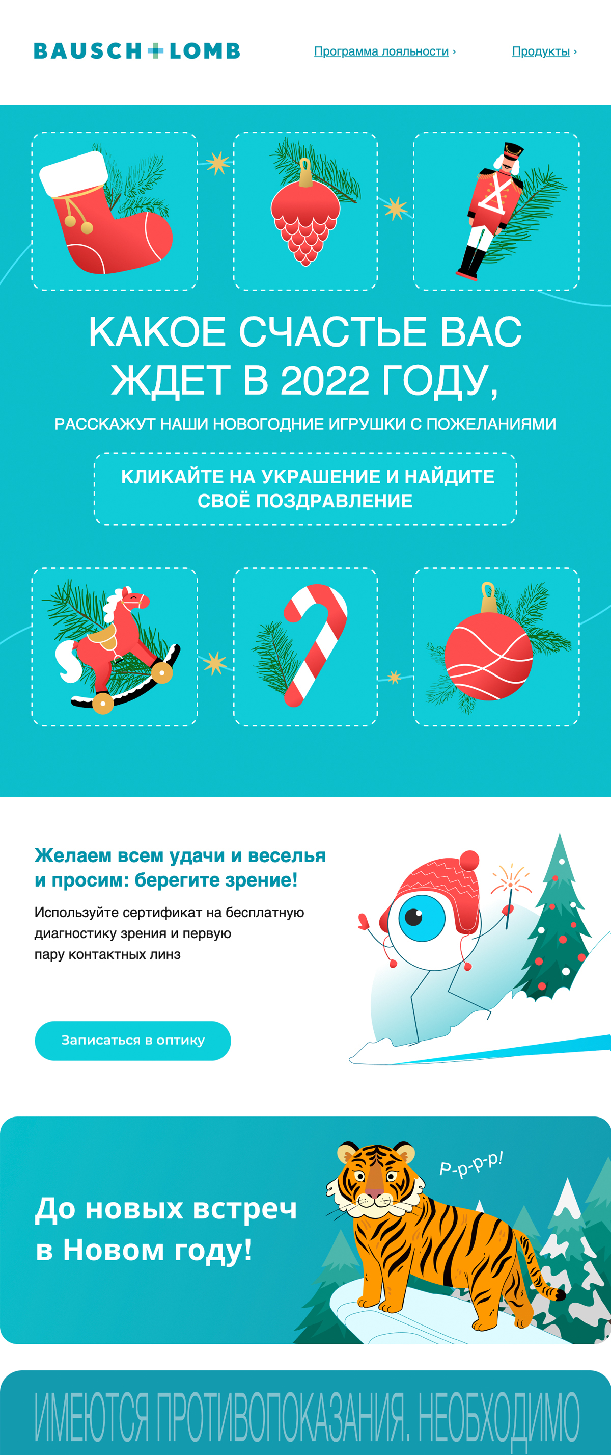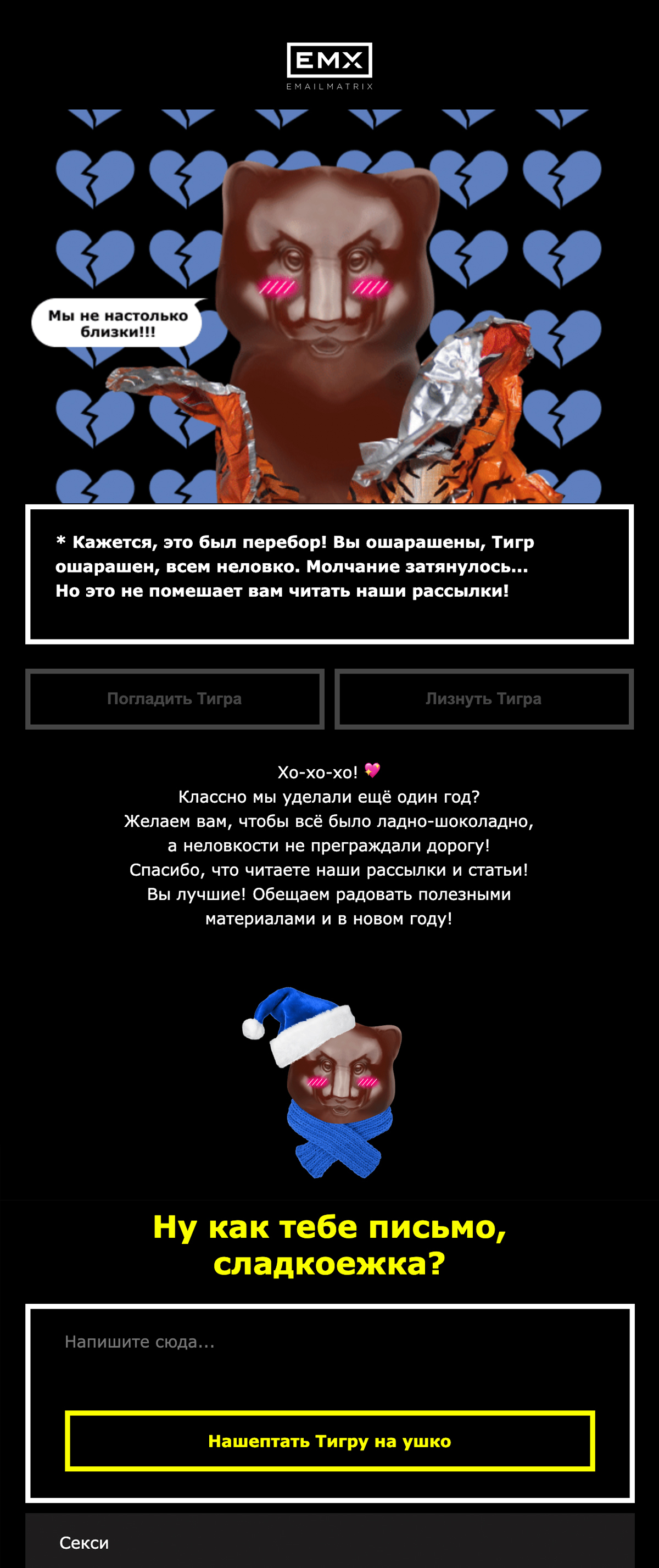 Креативное новогоднее AMP-письмо: можно погладить тигра и нашептать ему на ушко приятности в адрес создателей.