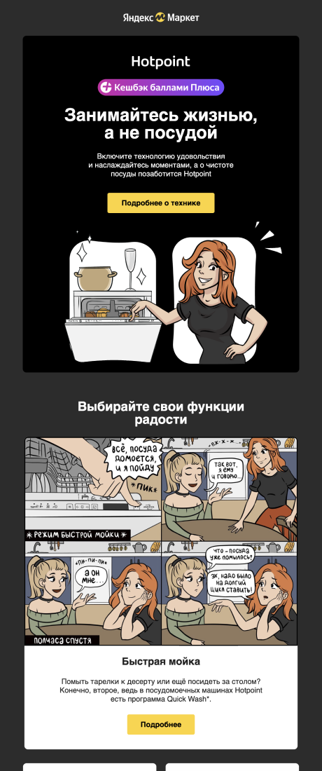 Занятный комикс про полезные функции посудомойки. Письмо не рассказывает о механических деталях и функции Superwash, оно показывает. Больше не придется спорить, кому отмывать грязную сковородку.