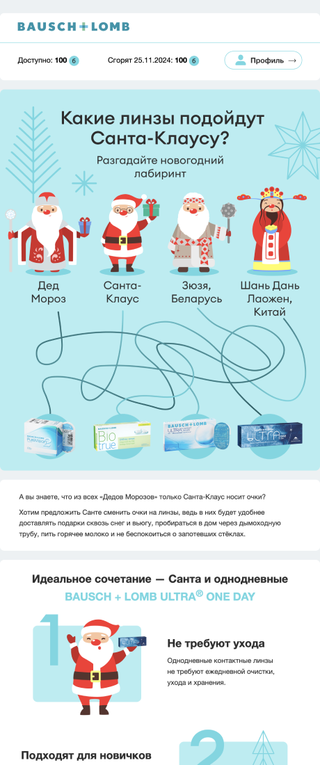 Санта — единственный зимний волшебник, который носит очки. Подписчиков просят помочь подобрать для него линзы. Возьмите на заметку: попробуйте найти связь ваших товаров с новогодней атрибутикой.
