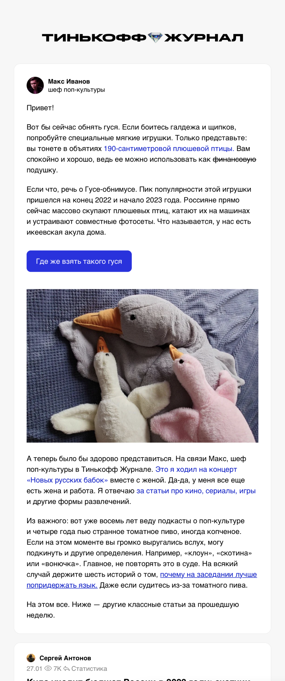 Отличительно приятный копирайтинг. Будто письмо от знакомого. Ну и да, теперь нам всем нужен гусь-обнимусь!