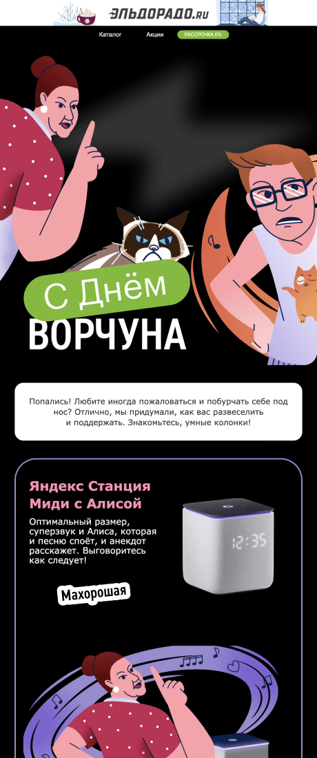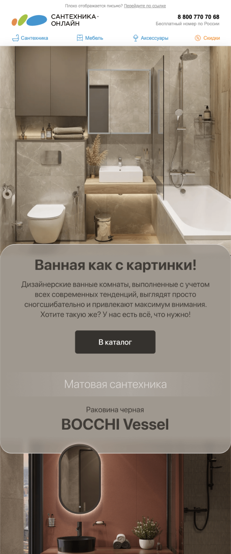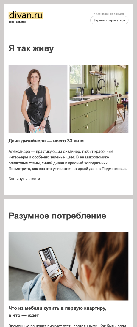 Вместо главного баннера — контентный блок дайджеста о личном опыте дизайнера интерьера. Заголовок «Я так живу» цепляет. В середине письма есть эффектное до и после преображения квартиры.