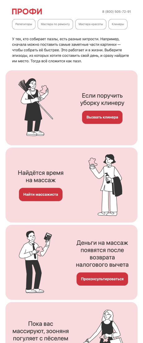 Структура текста помогает быстро считать главное: пора выбрать профи. День сложится отлично, если каждый будет занят своим делом и вам не придется тащить всё на себе.