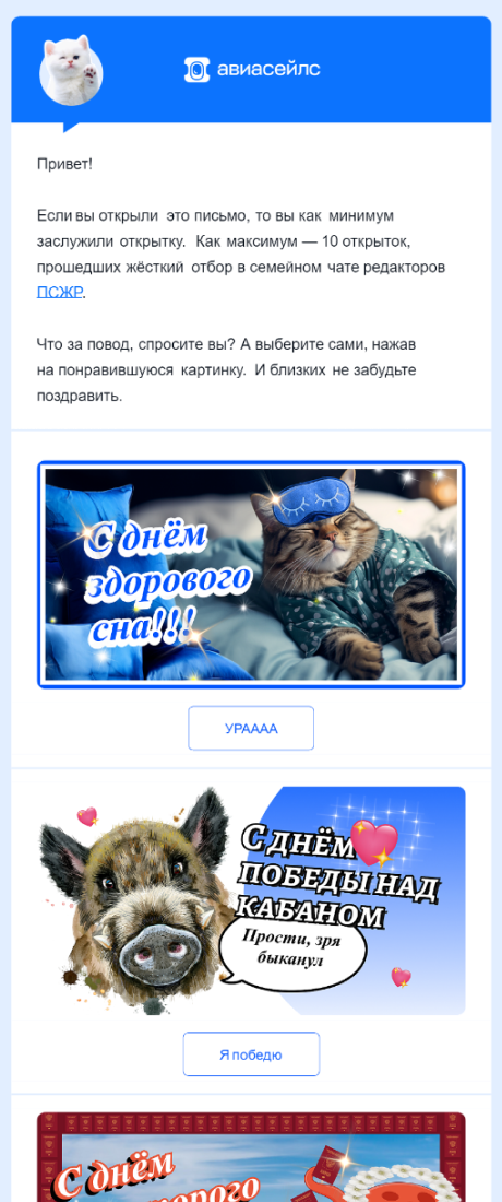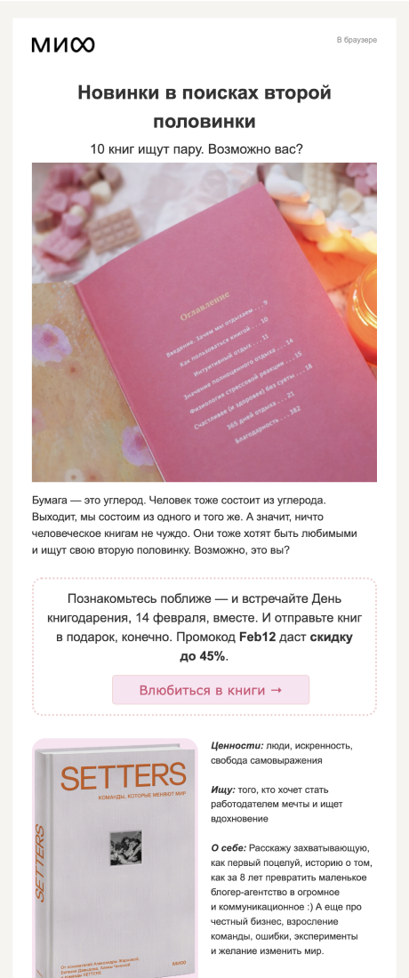 Рассылке есть куда расти в сторону дизайна, но тексты вытягивают ее на достойный уровень уже сейчас. Описание книг в стиле анкет дейтинг-приложения — крутая задумка на 14 февраля.