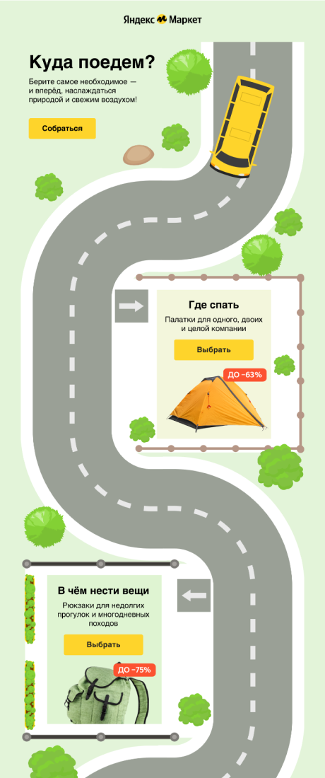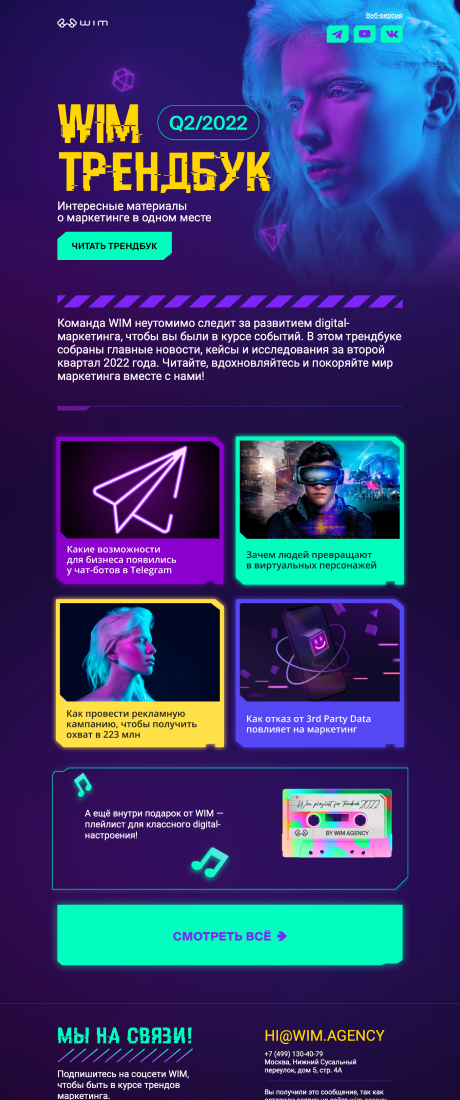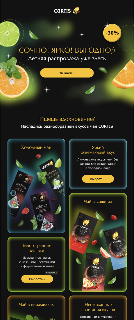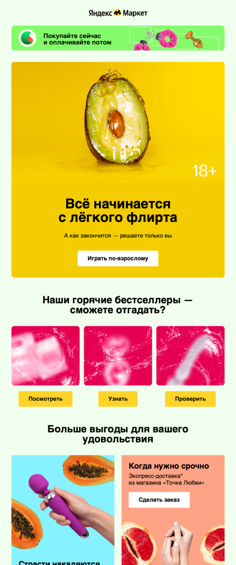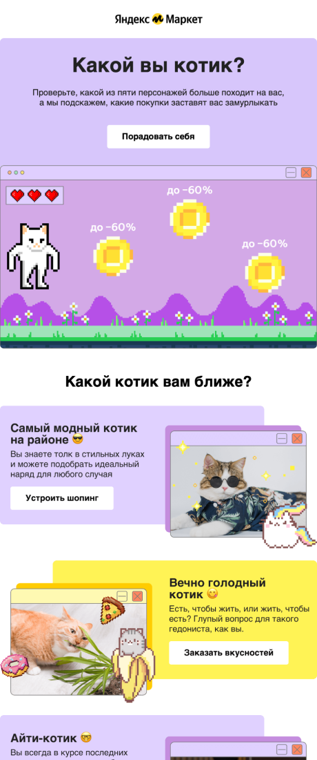 Креативный подход к кнопкам и заголовкам. Текст интригует и заставляет перейти по ссылкам.