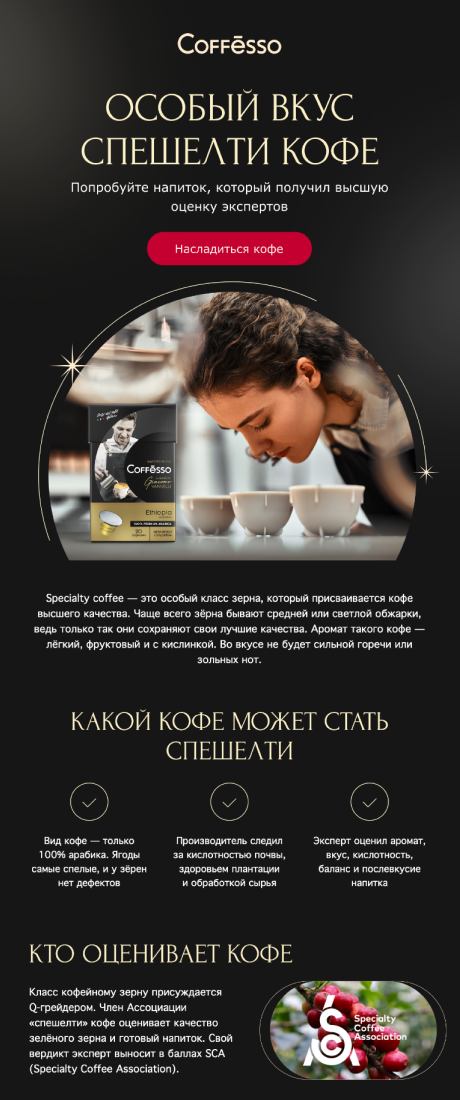 Деление на смысловые блоки помогло доступно рассказать о спешелти кофе от обработки до приготовления дома. Остается только заказать, чтобы попробовать самому!