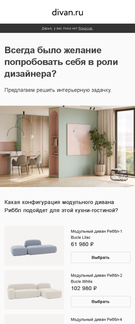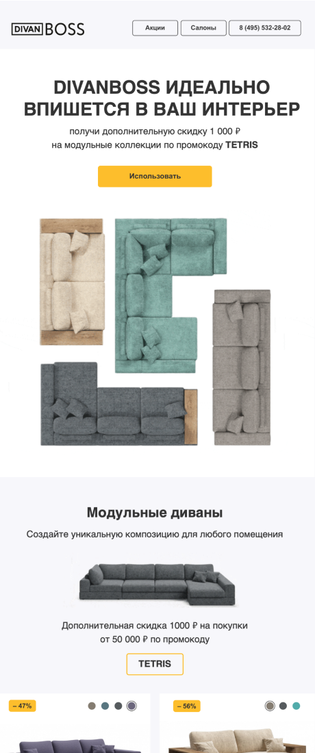 Продуманный и очень аккуратный шаблон письма с гифкой в подвале позволяет DIVAN.RU быстро делать стильные рассылки.