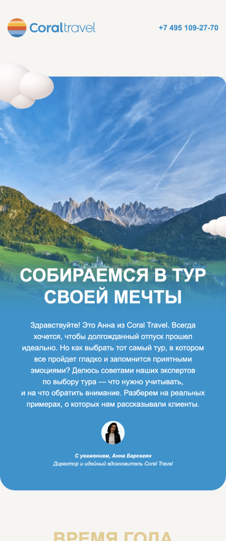 Советы экспертов по выбору тура основаны на реальных ситуациях туристов. Пока читаешь яркую летнюю рассылку, смотришь на сочные кадры из разных стран, сам того не осознавая, начинаешь сильнее хотеть в отпуск.