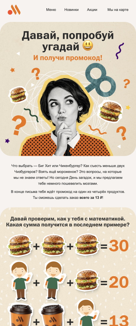 Веселое письмо в стиле задачек с аппликациями из детских журналов. А если бы головоломки были не просто развлекательными, а еще и прятали промокод, стало бы интереснее их разгадывать.