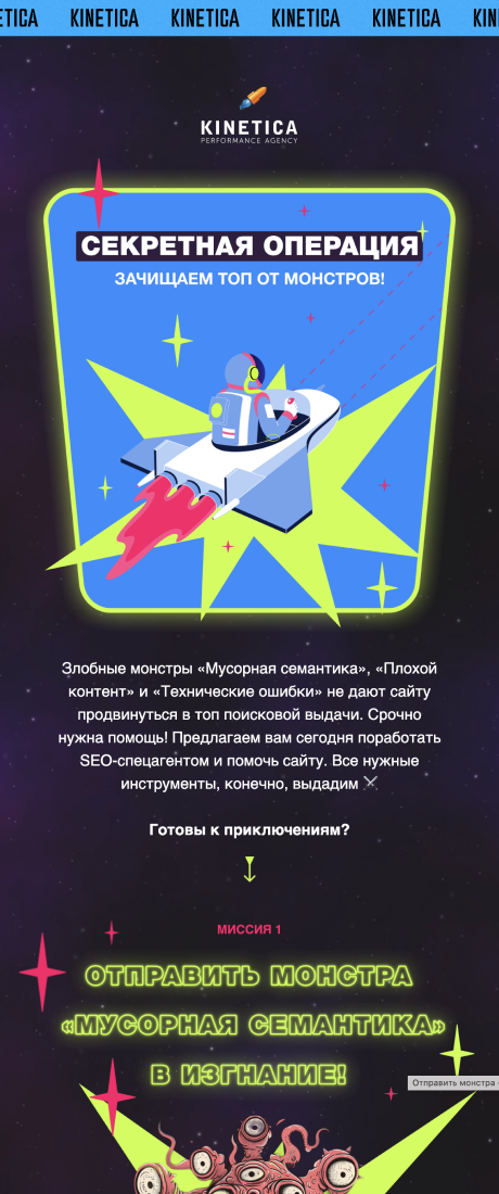 AMP-письмо в неоновом дизайне c самыми страшными монстрами мира SEO. Жаль, что не предусмотрен CTA для тех, кто сразу хочет почитать о мусорной семантике и не готов тратить время на игрульки с монстрами.