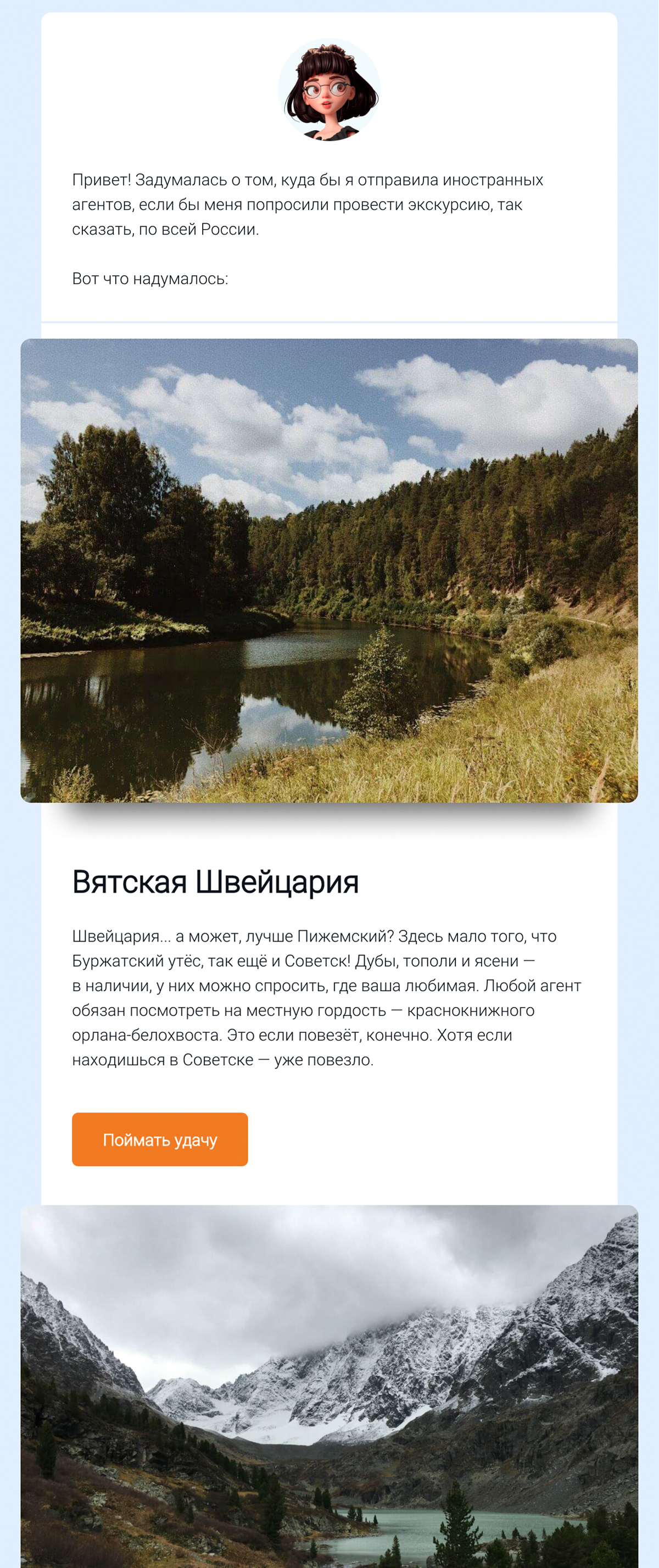 К хорошим письмам от Aviasales быстро привыкаешь! Тексты — полезные и с юмором, картинки — крупные, СТА — с gif-анимацией.