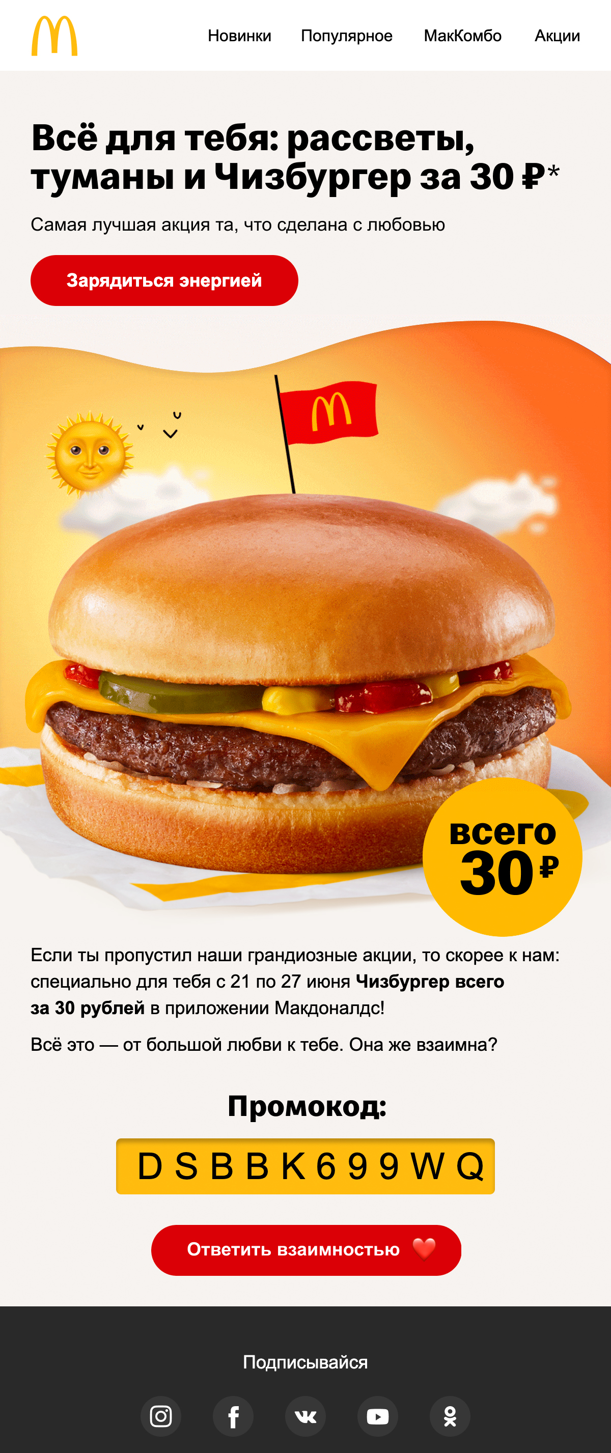 Душевный копирайтинг вместе с аппетитным бургером и промокодом привлекут тех, кто давно не открывал письма.