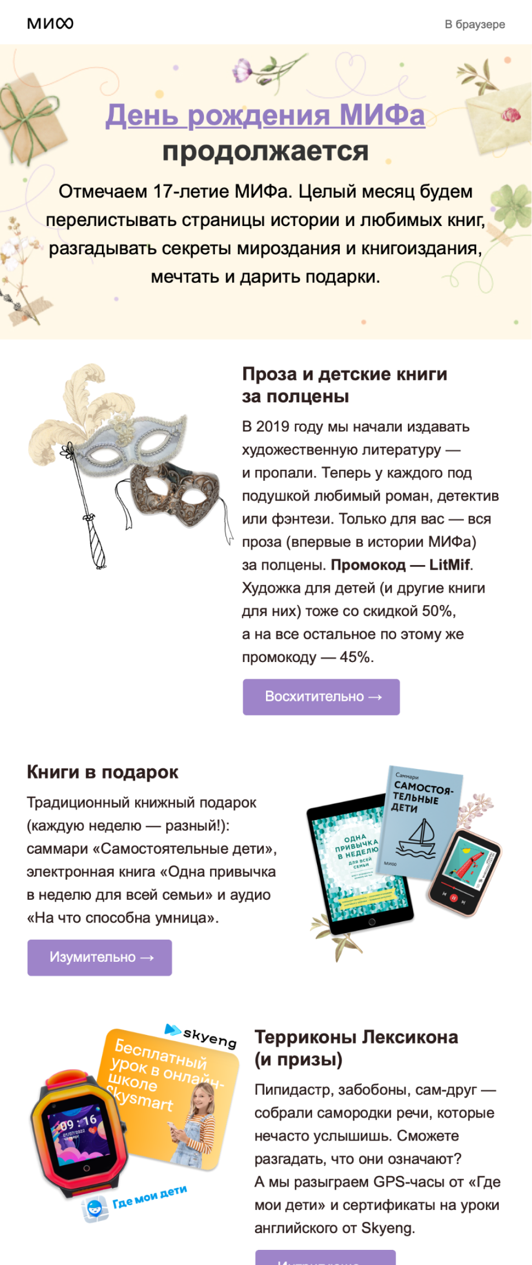 Яркий баннер и лаконичные блоки с понятной структурой. Что еще нужно для хорошего промописьма?