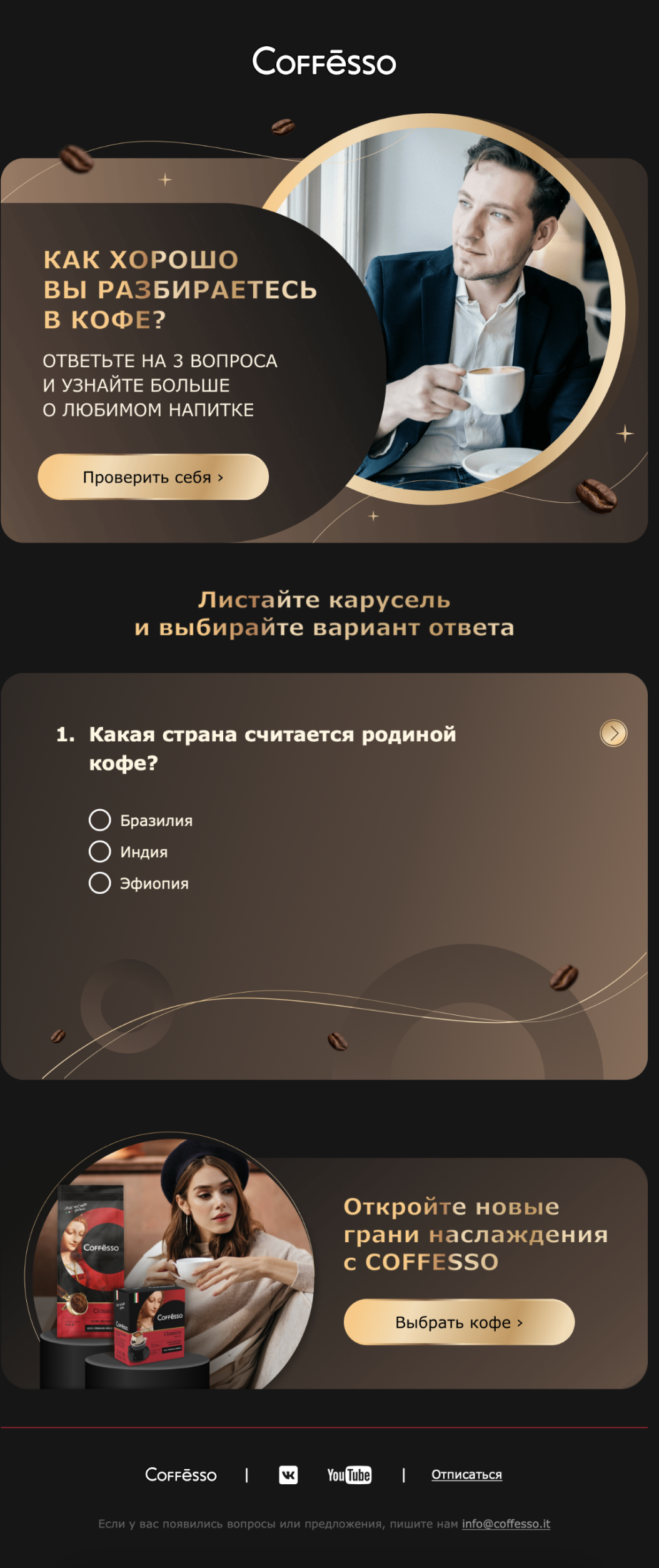 Вдвойне интригующее письмо — заход через любопытство и тема кофе, которая мало кого оставит равнодушным.
