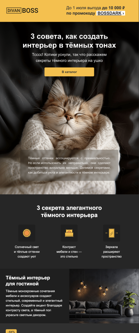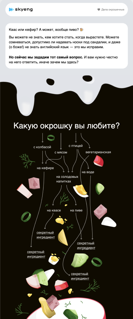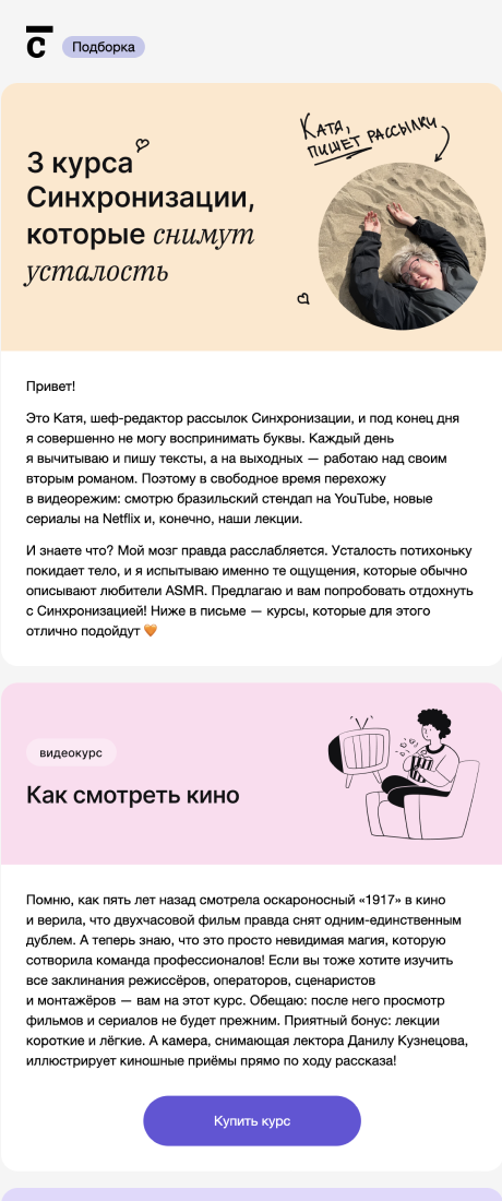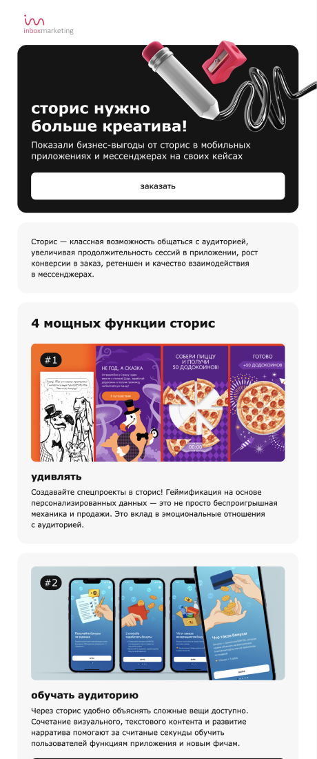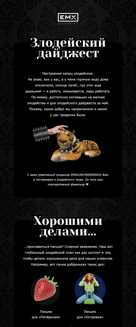 Крупные иллюстрации-кейсы структурируют письмо и привлекают дополнительное внимание к сторителлингу. Все элементы письма выстраиваются в стройную логику, а насчет верстки — комар носа не подточит!