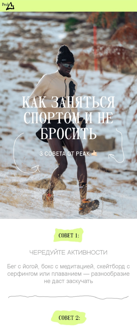 Дружелюбный тон помогает не корить себя за пропущенную тренировку, а вернуться к занятиям с новыми силами и формой из Peak Store.