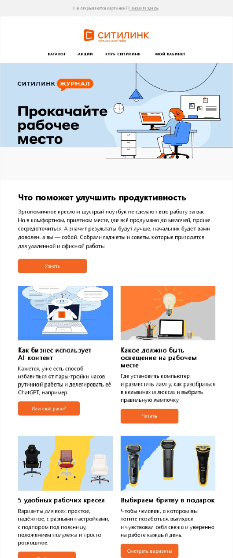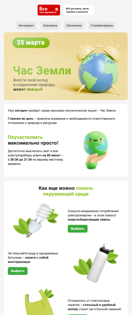 Экологическая повестка всегда актуальна и полезна. Письмо читается легко, акценты расставлены правильно, а подборка товаров поддерживает тему заботы о природе.