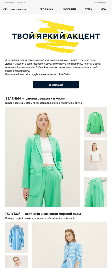 Отличная подборка для образа в стиле колорблокинг! Яркие краски пробуждают весеннее настроение, а тексты помогают сформировать эмоциональную связь между товарами и читателем.