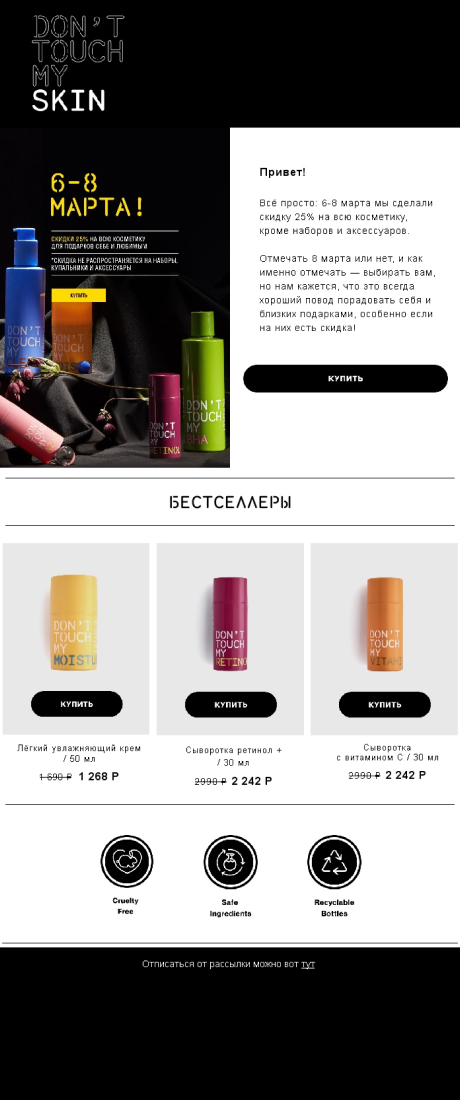 Вместо поздравления с 8 Марта компания просто проводит акцию и учитывает интересы своей аудитории. Как бы вы ни относились к празднику, получить скидку всегда приятно.