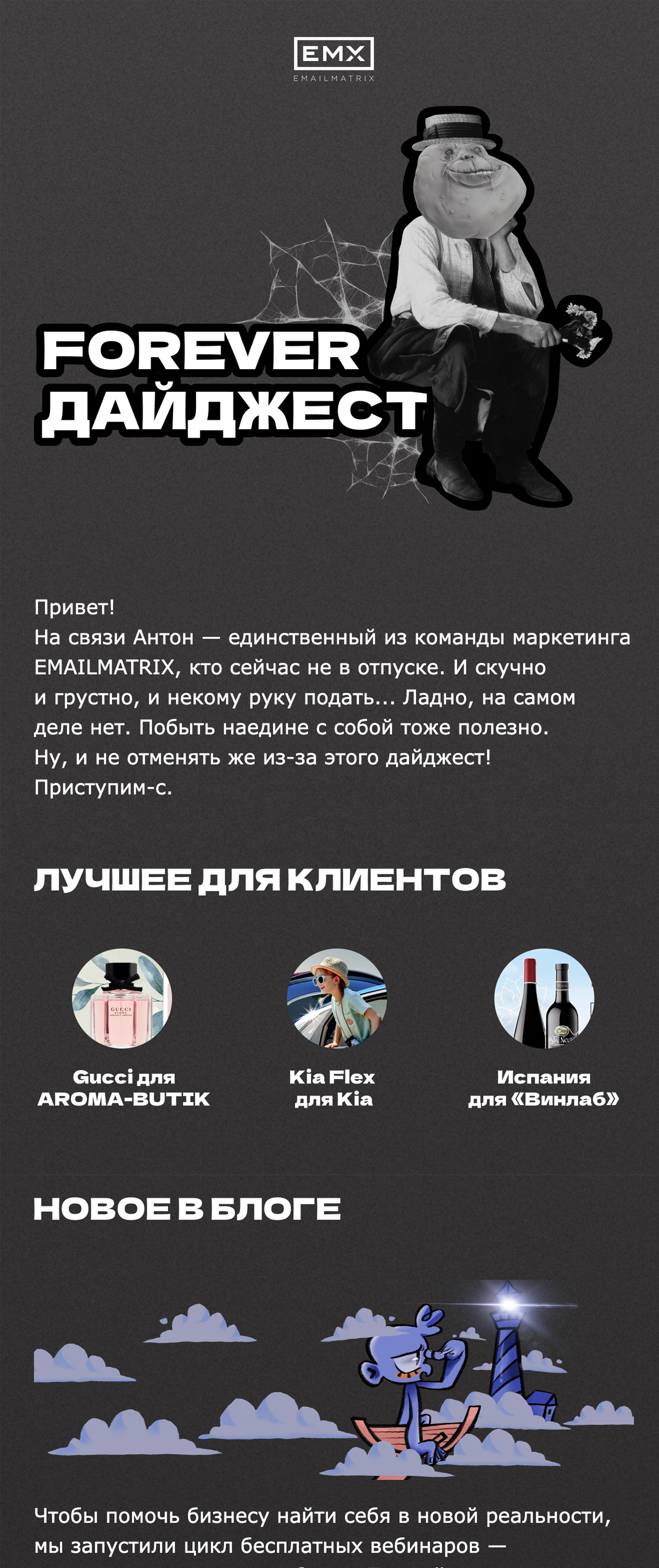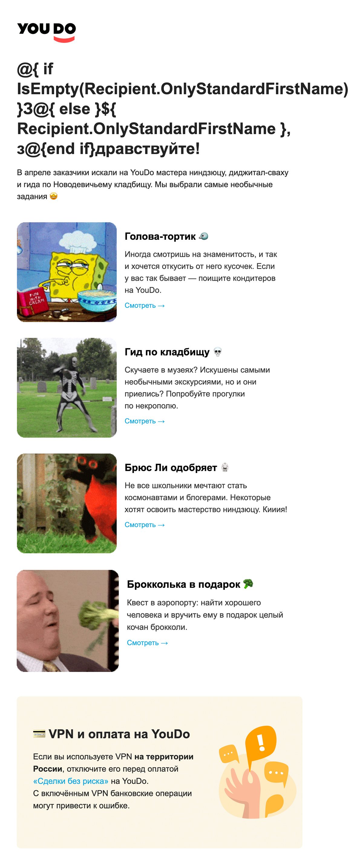 Отличный пример, как сделать забавным дайджест: грамотный копирайтинг и зубодробительное количество гифок.
