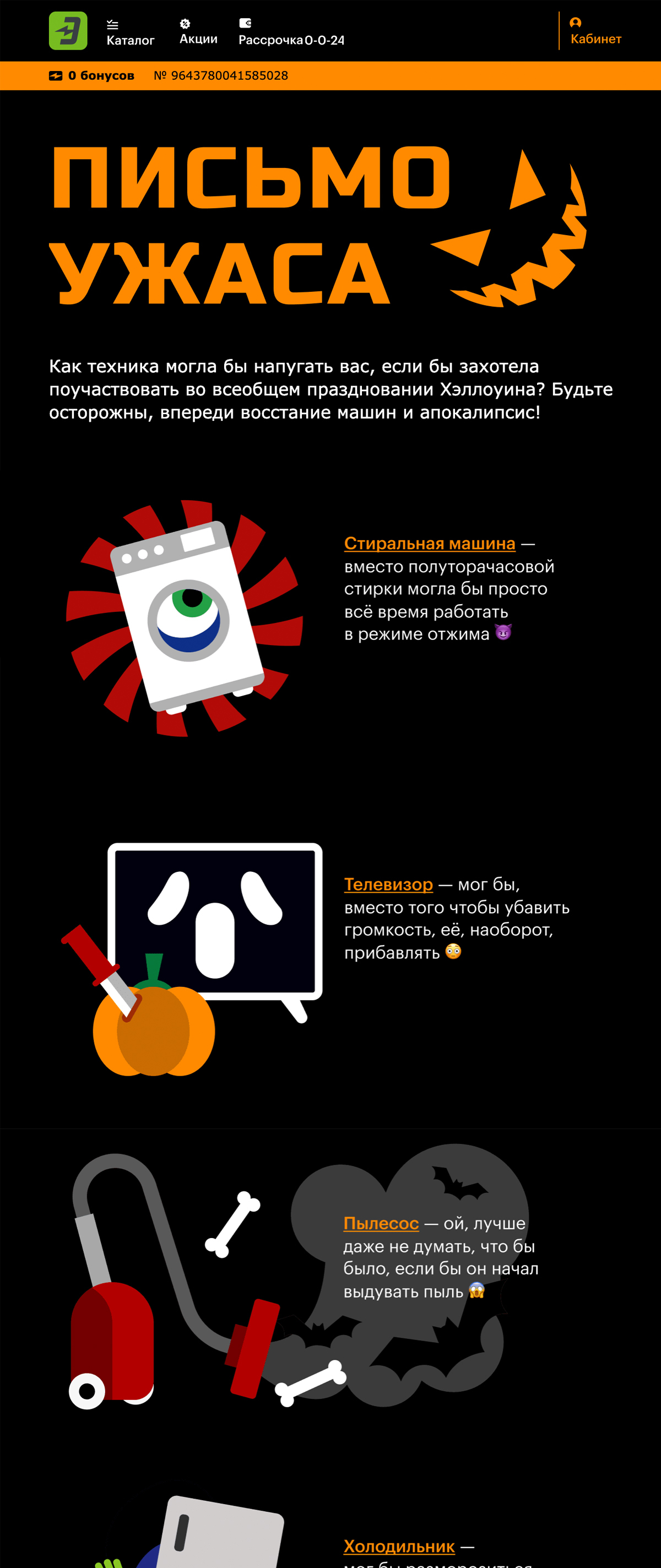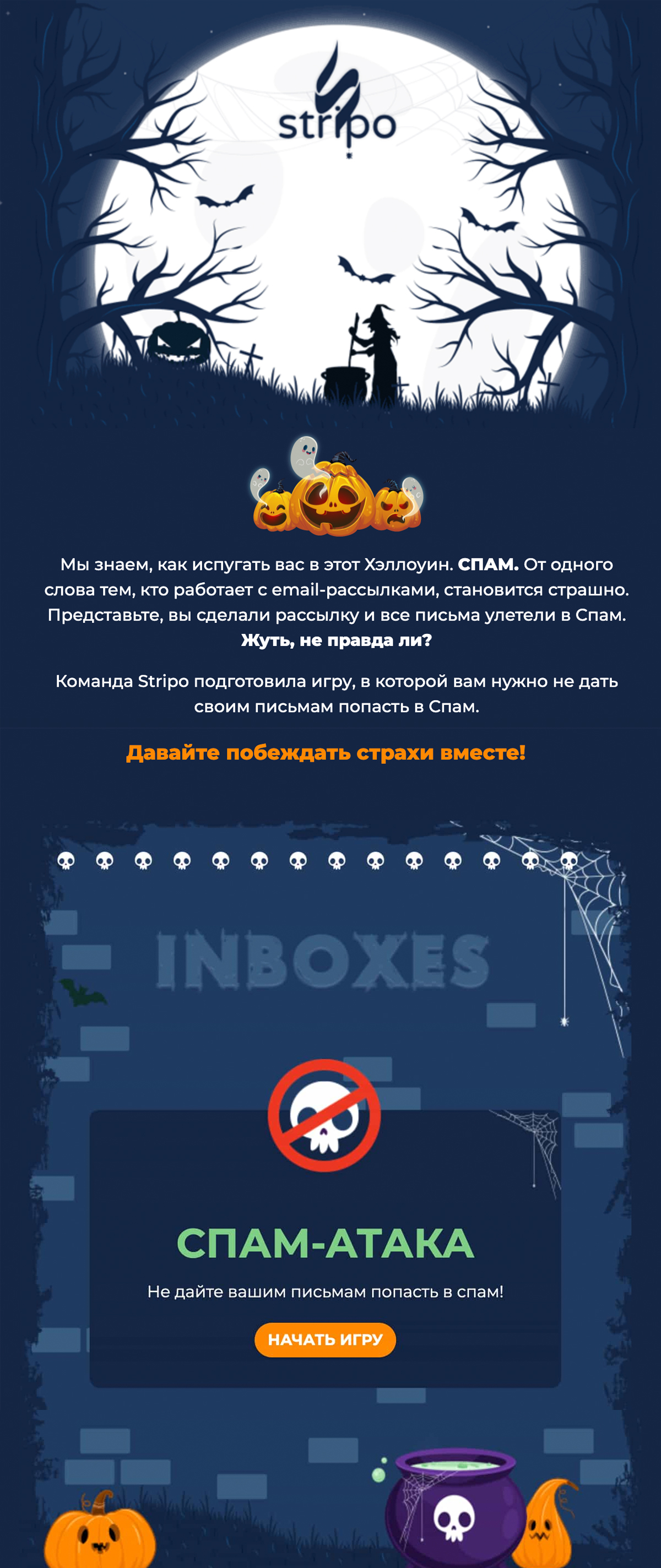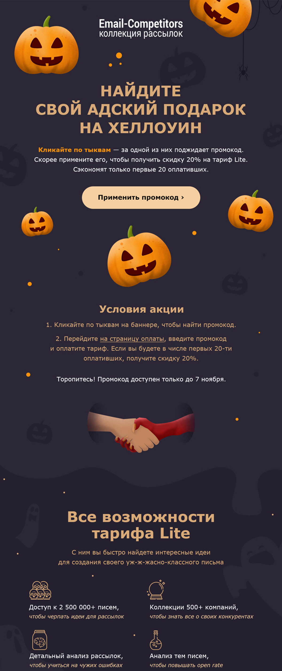 Еще один хороший пример письма к Хеллоуину без тыкв. Необычное GIF-изображение на первом баннере заставляет улыбнуться и подогревает интерес к анонсируемой статье.