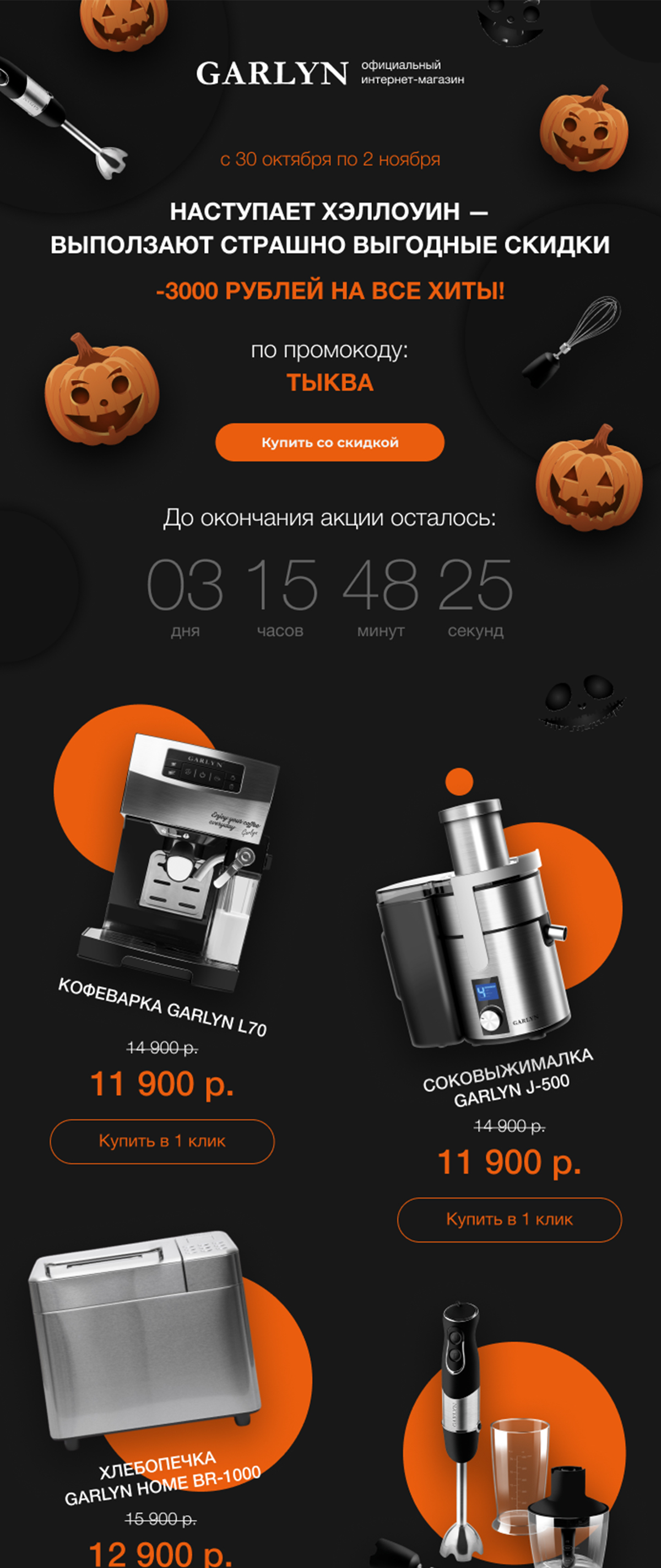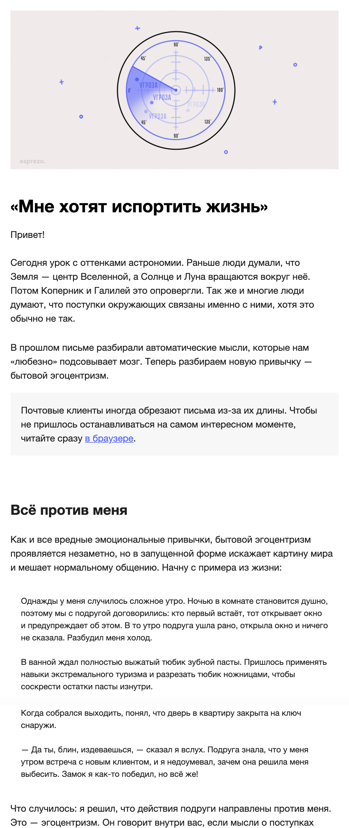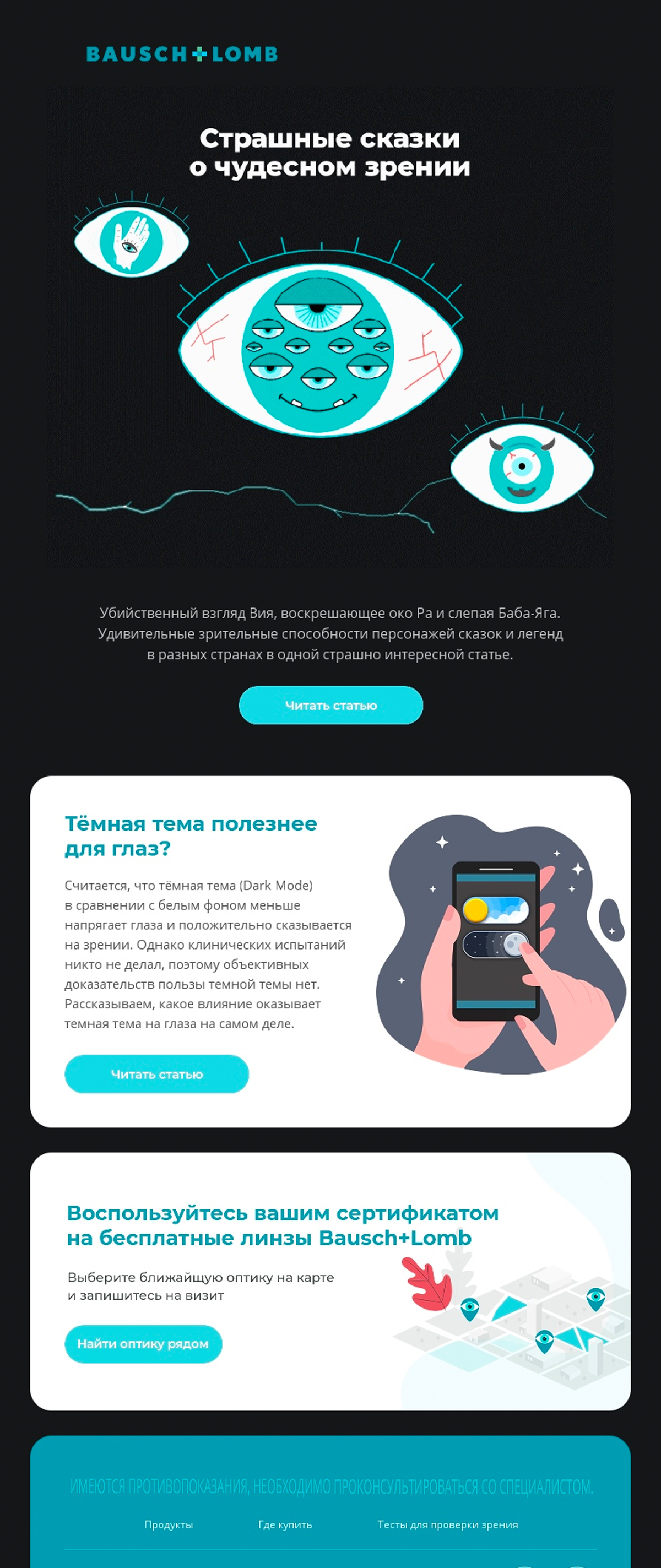 Еще один хороший пример письма к Хеллоуину без тыкв. Необычное GIF-изображение на первом баннере заставляет улыбнуться и подогревает интерес к анонсируемой статье.
