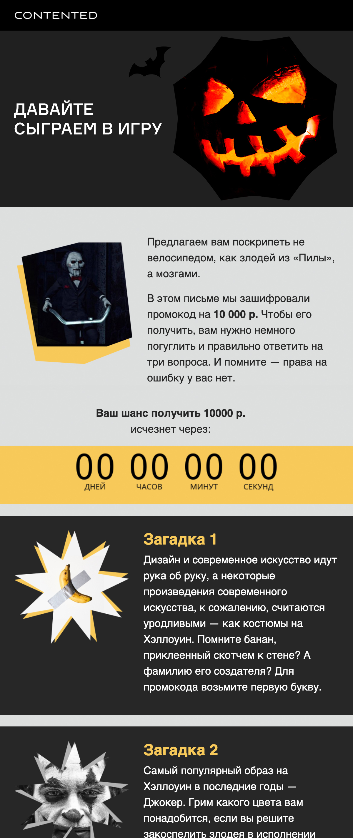 Очень хороший пример письма с загадкой. Интересная механика, которую просто реализовать, а достойный подарок стимулирует к взаимодействию.