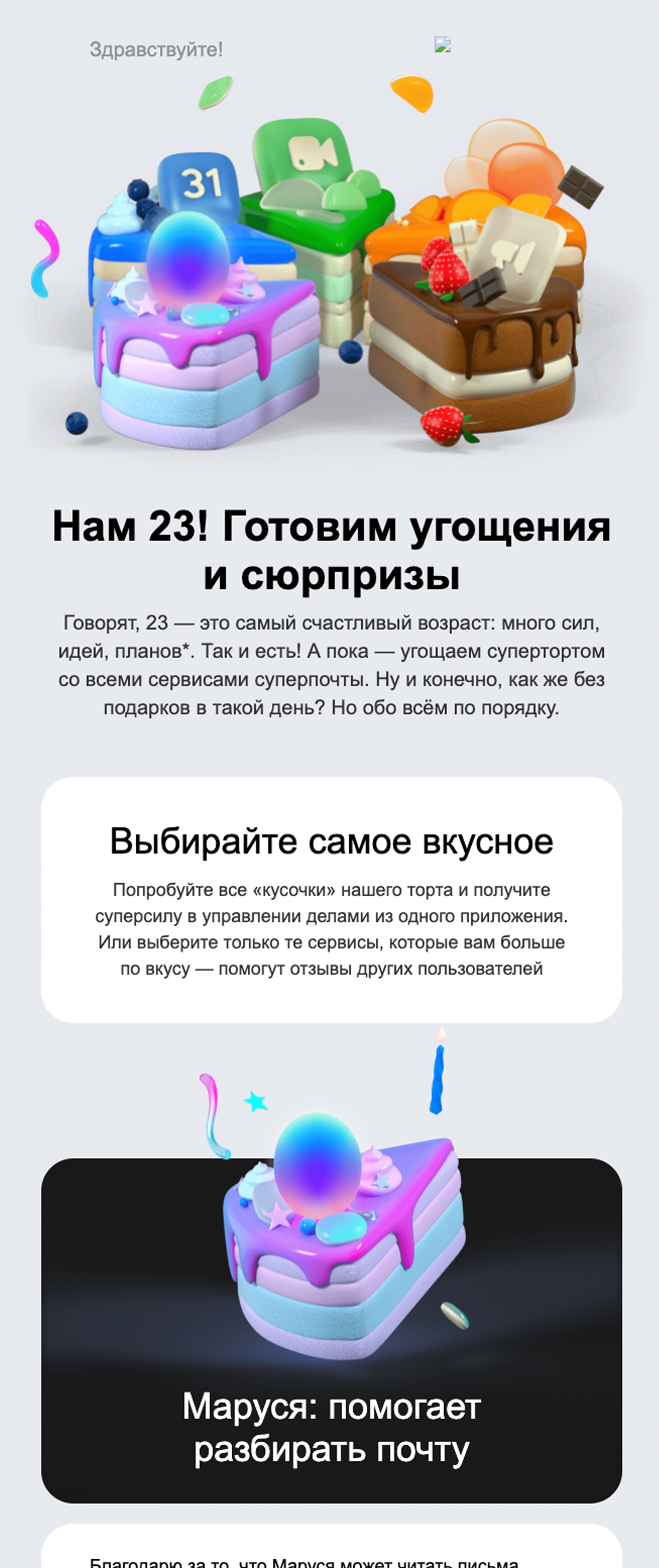 C днем рождения, Mail.ru :) Красивые и «вкусные» 3D-иллюстрации, а само письмо лаконичное и структурированное.
