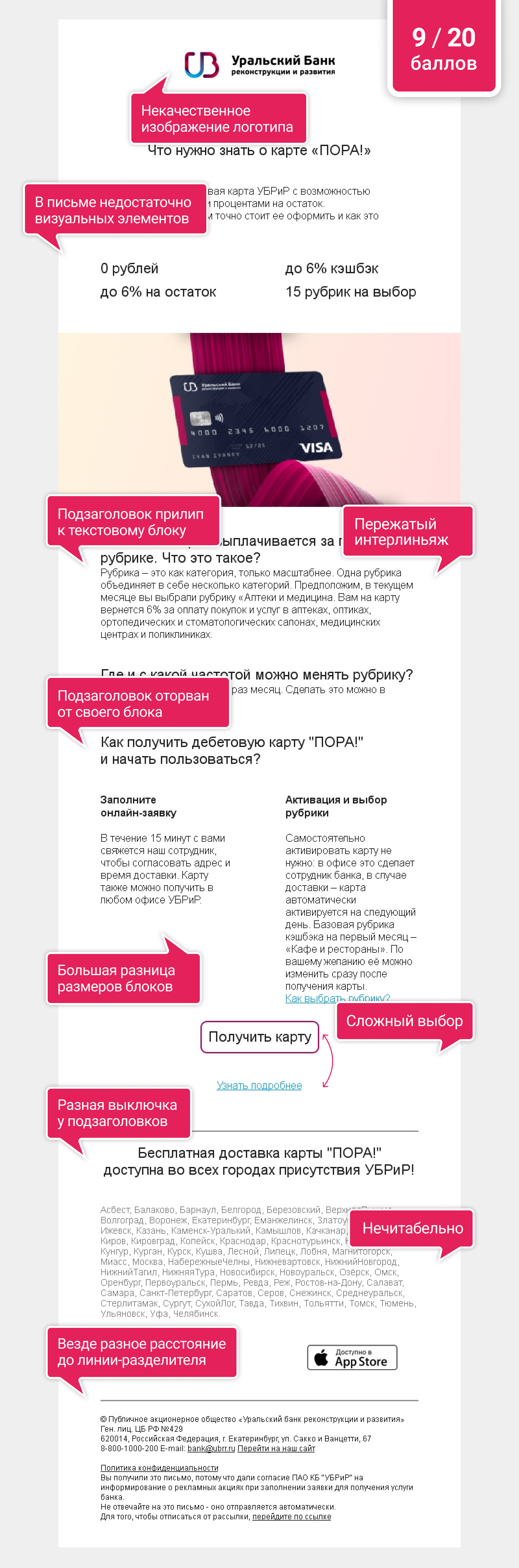 1. Заголовок не цепляет и непонятно, кому адресован. Если у подписчика карты нет, он не задается вопросом, что ему нужно знать о новом продукте. Если уже есть, то человек уже всё должен знать. Эффективнее написать главную выгоду продукта, например: «Карта „ПОРА!“ с кэшбэком 6%».