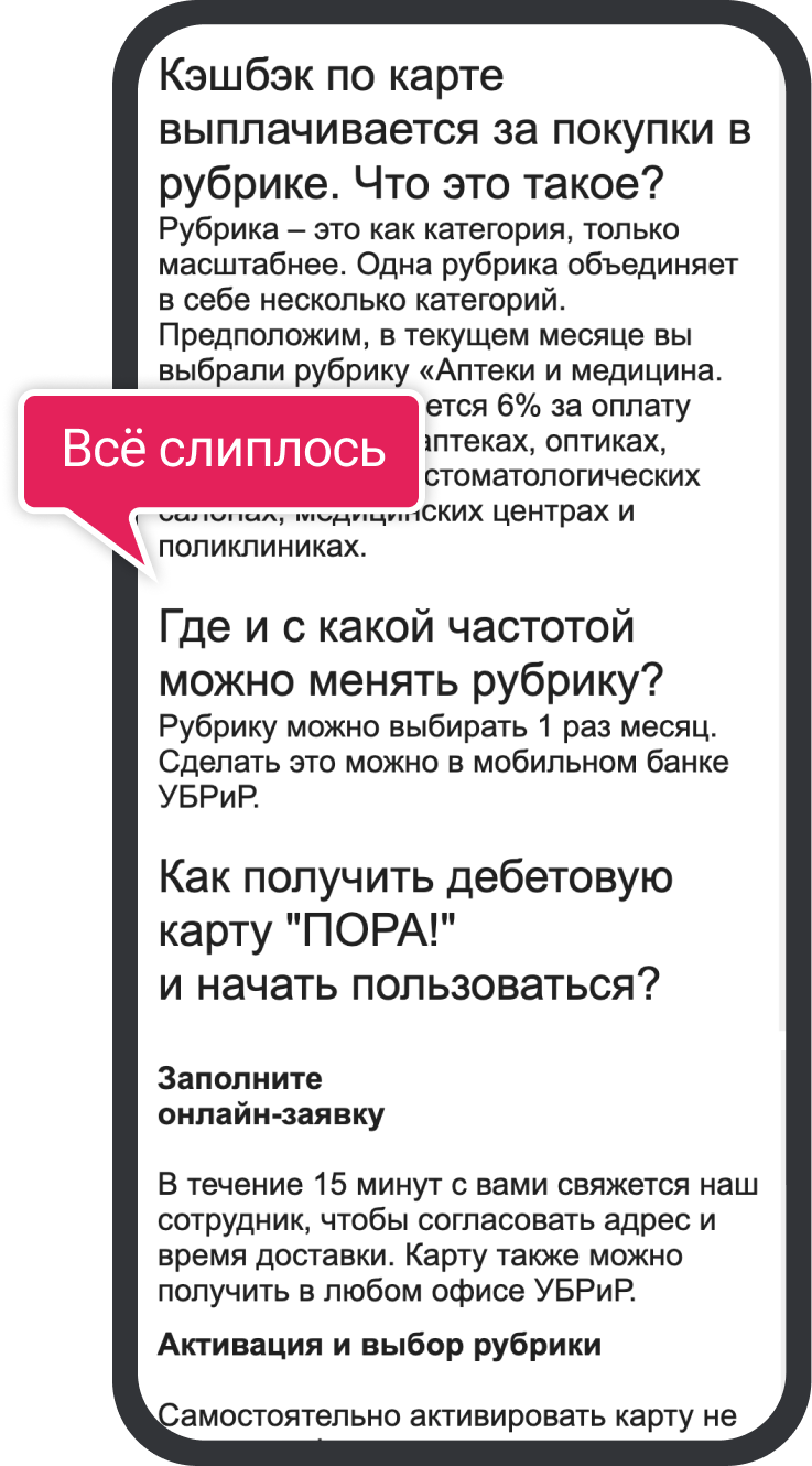 9. Блок «Как получить карту…» как будто сделан в последний момент. Часть про «Заполните заявку» написана хорошо: ясно и кратко. Про активацию и выбор рубрики — всё в кучу. Их стоит разделить на разные шаги, а весь блок — задизайнить.